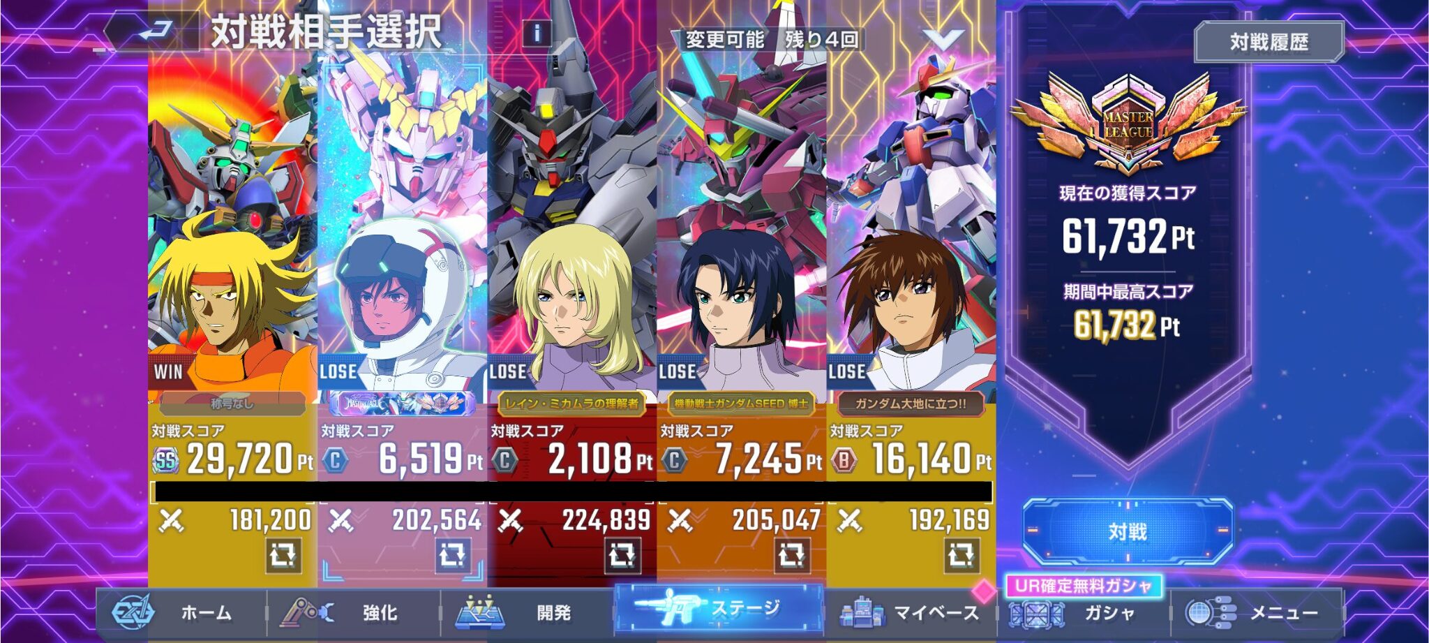 プラチナくらいから相手のガチャ産URが割ときつくて正直、「無理だろうな」と思いながらの挑戦だったので、ここまで行けたのはちょっと意外でした。