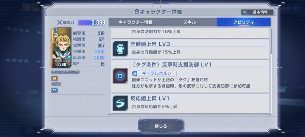 守備値が高いわけではないのですが、注目なのが”反撃時支援防御“。前回のピックアップのスレッタと同じでこちらの攻撃時、相手のカウンターを支援防御できるというもの。スレッタが引けなかったのもあってジュリエッタを試してみましたがゴッドとの相性が良く、ゴッドの身代わり役としてかなり活躍してくれました。今回の実質的なMVPと言っても過言はありません。